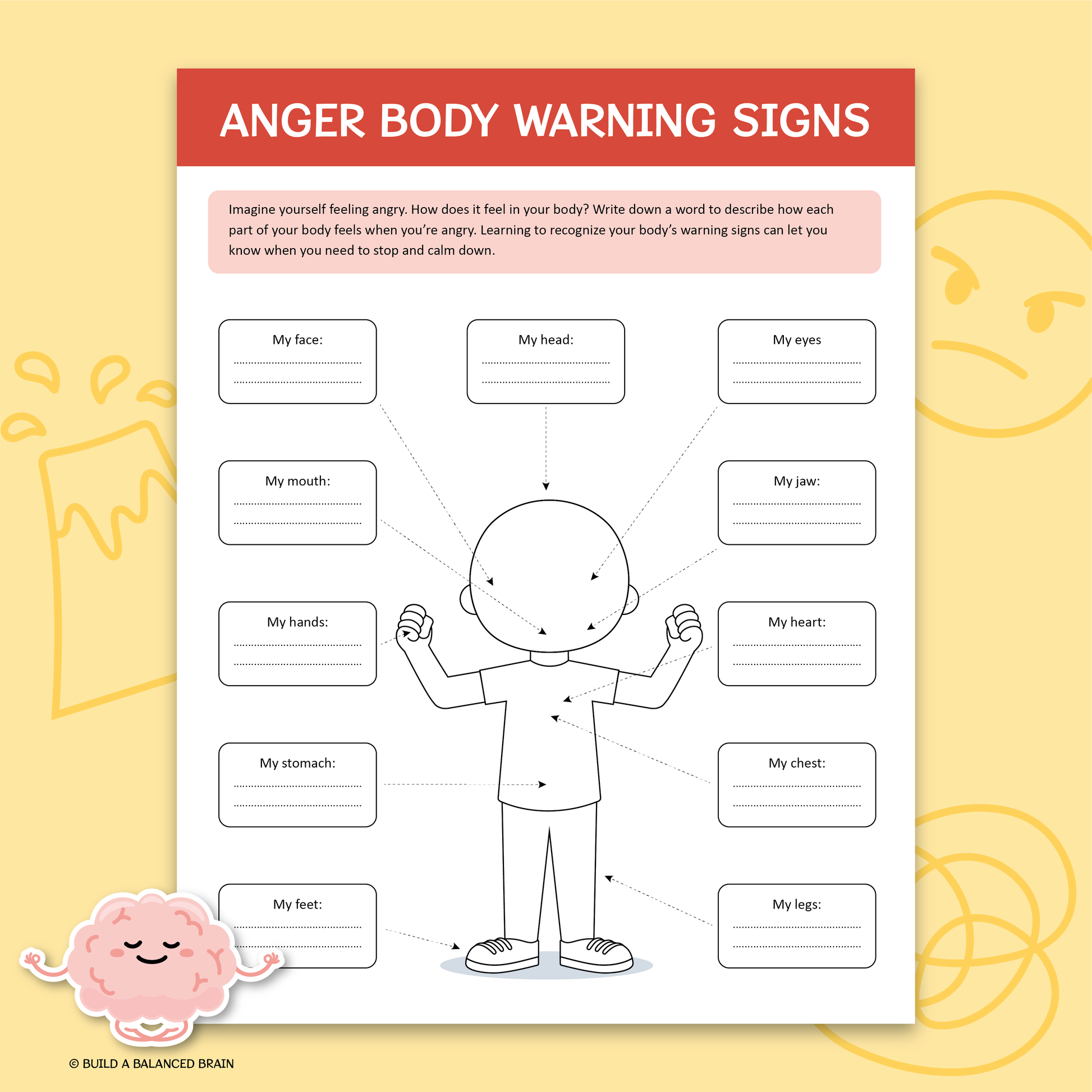 The Anger Warning Signs worksheet teaches children and young people to recognize physical cues of anger, like clenched fists or a racing heart, and learn to manage difficult emotions before they escalate. A helpful tool for emotional regulation and early intervention in a supportive, engaging format.