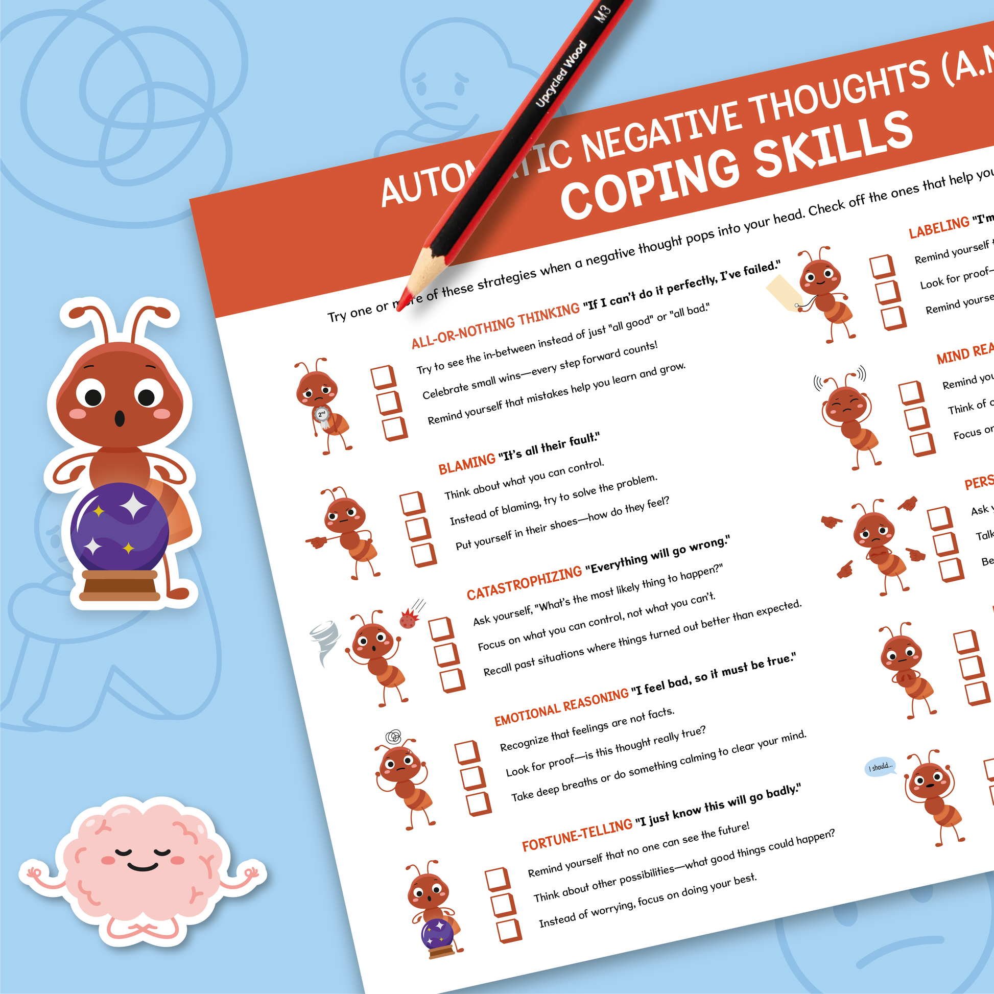 Help children recognize and challenge unhelpful thoughts with this bright, easy-to-understand Coping Skills for ANTs Poster! Featuring 10 common “ANTs” (Automatic Negative Thoughts) like All-or-Nothing Thinking, Catastrophizing, and Mind Reading.