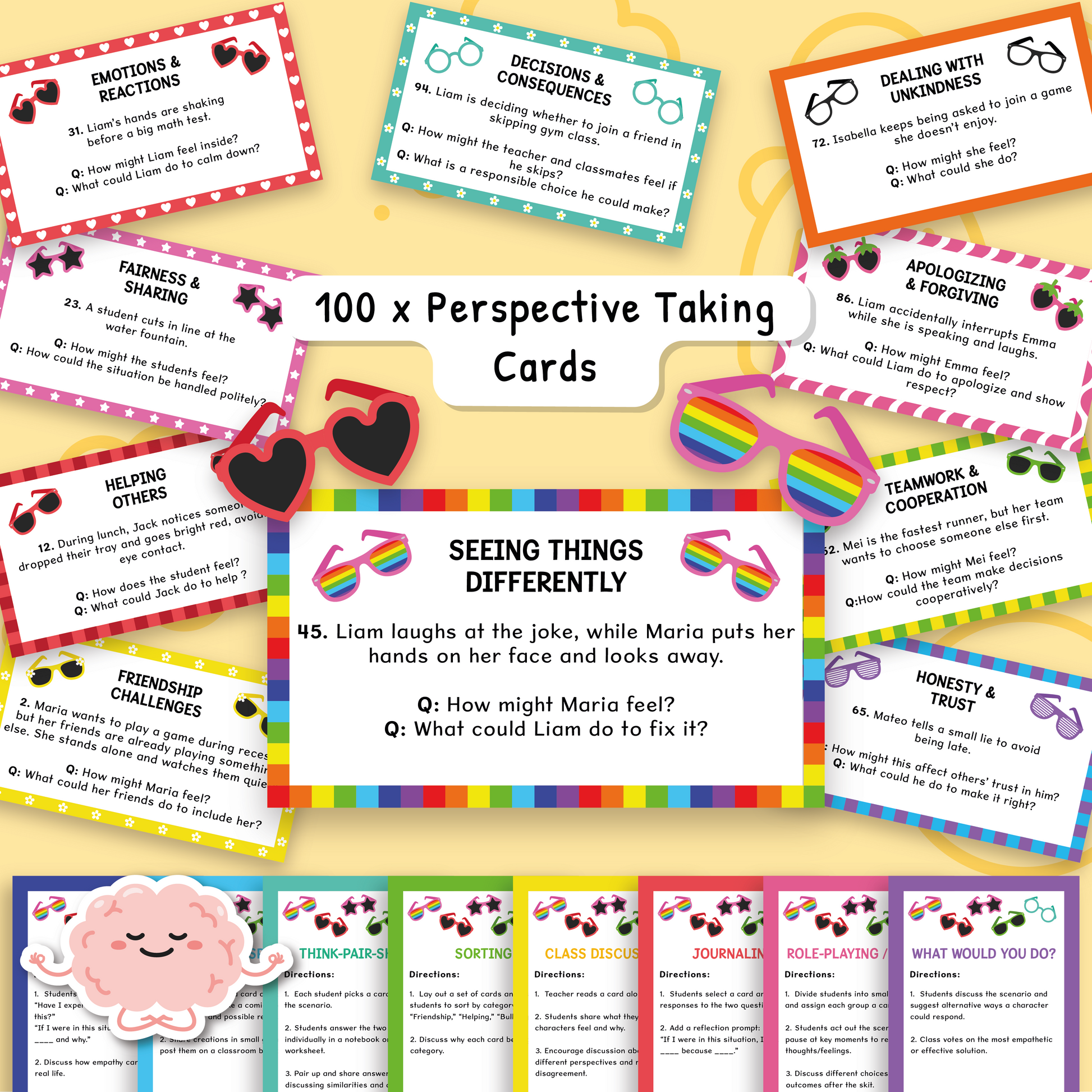 - Perspective Taking Scenario Cards – 10 pages (100 cards, 10 per page). Each card measures 3.5" × 2".