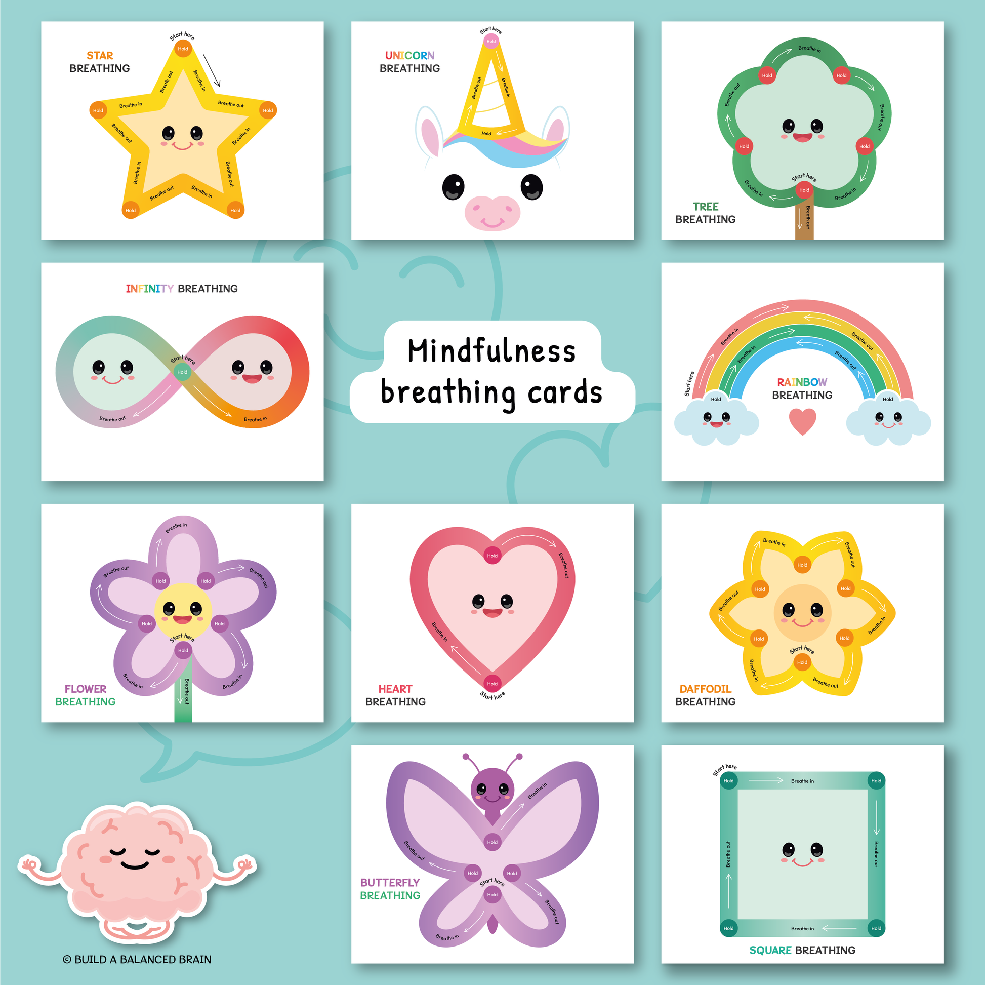 10 x mindfulness breathing cards on 10 pages (PDF). Everything is designed for easy printing in both Letter and A4 sizes.
