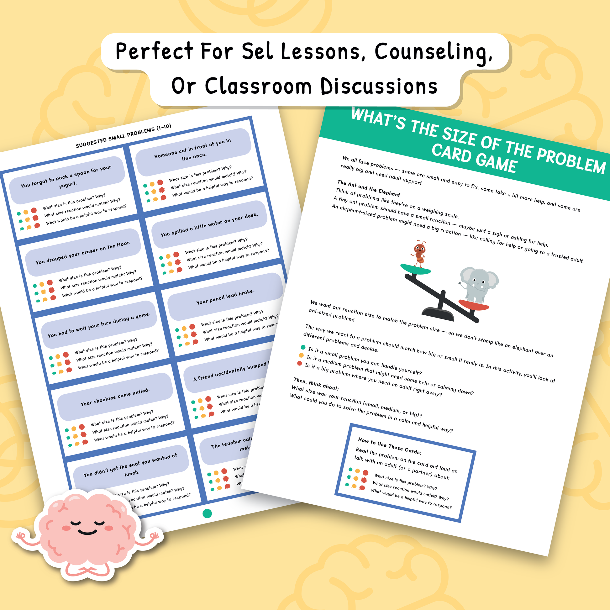 This engaging 18-page printable SEL bundle helps children aged 6–11 learn to recognize the size of a problem, match it with a right-sized reaction, and decide what to do next. Using a child-friendly traffic light system (green = small, yellow = medium, red = big) alongside playful ant and elephant characters, this resource teaches students how to pause, assess, and respond to everyday challenges.