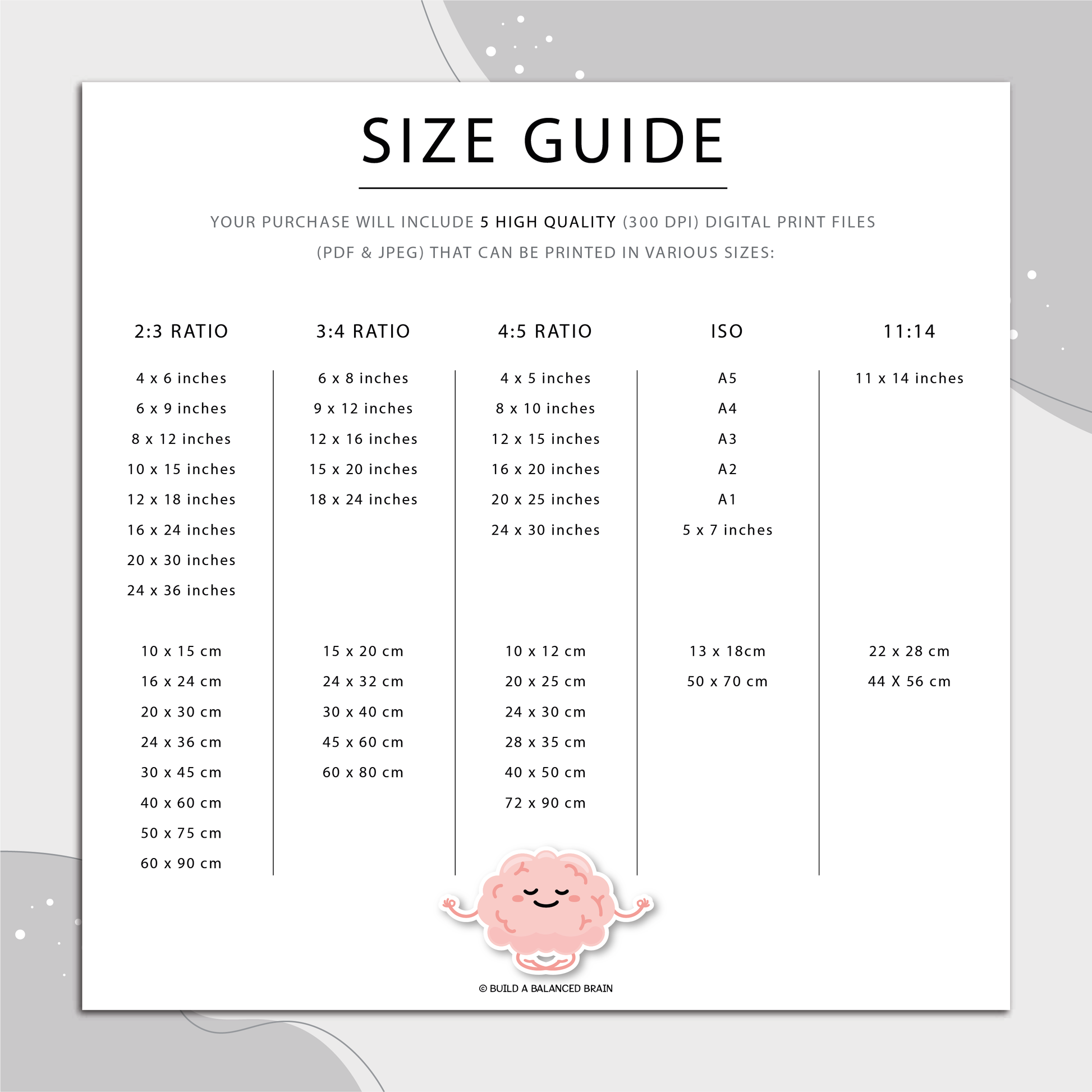 You will receive 5 high quality (300 dpi) PDF files and a printing size guide. You will also receive UK and US spelling variations.